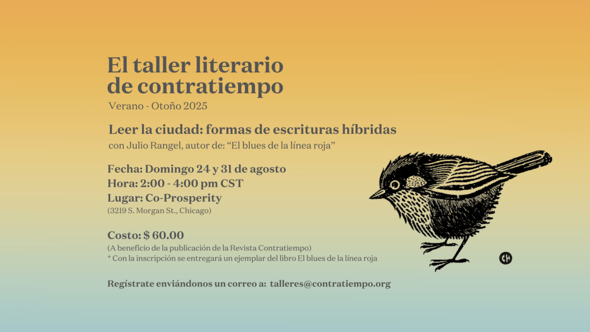 Contratiempo te invita a la presentación del libro: El blues de la línea roja de Julio Rangel Fecha: Viernes, 6 de junio del 2025 Hora: 7:00pm – 8:00pm Lugar: Pilsen Community Books (1102 W 18th St, Chicago) Acompáñanos a una conversación con Silvia Goldman, Marco Escalante y Julio Rangel sobre las trayectorias y […]