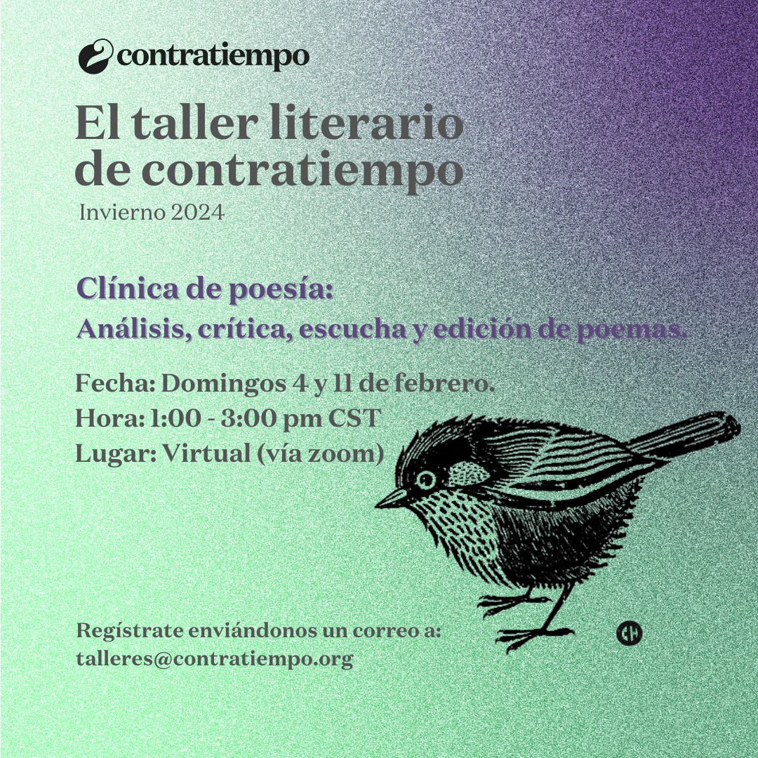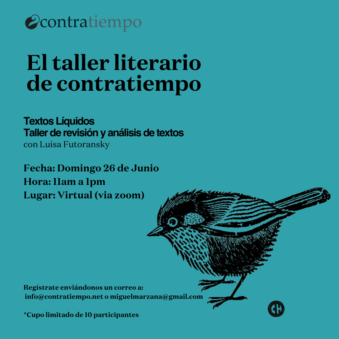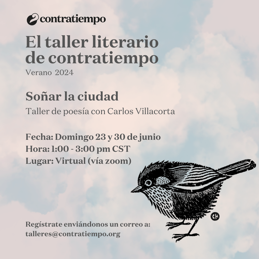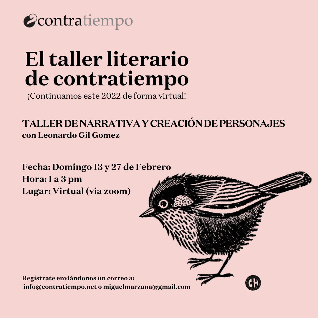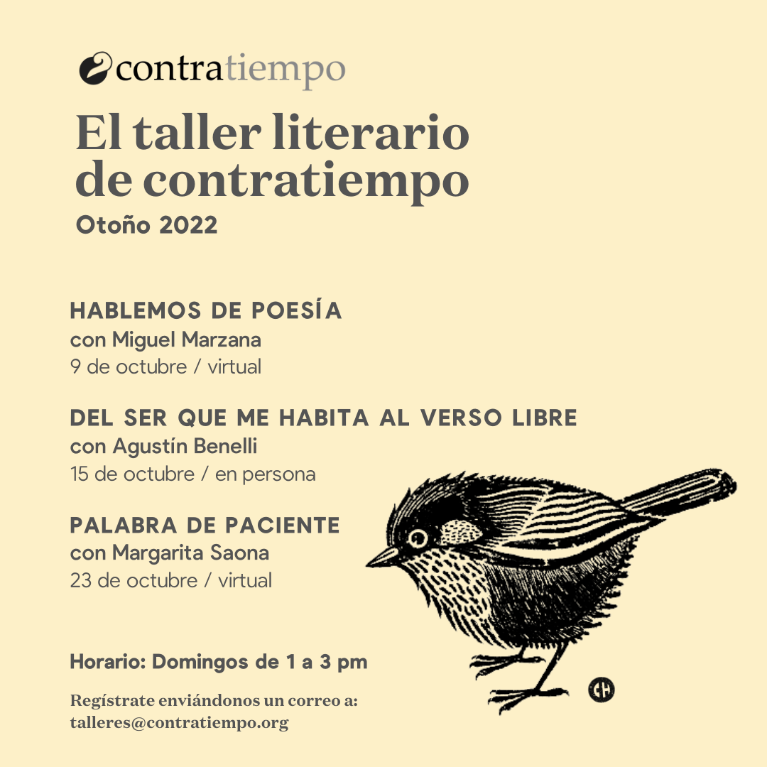 El taller literario de contratiempo no es un discurso, no es un método, no tiene una fórmula para hacerte poeta o escritor. El taller por su connotación artesanal es un lugar donde se trabaja la palabra y se siembra lo que se escribe, se riega con lo que se desaprende y sólo depende de uno que se coseche algo. El taller es un espacio donde se lee, se analiza, se cuestiona, se aprecia y se critica; es un espacio abierto cuyo centro de retroalimentación está en el intercambio y desarrollo de textos, el amor por la literatura, y la necesidad de escribir. ¿Sufre de monólogos?, ¿gerundios, adverbios?, ¿le han diagnosticado mala poesía?, ¿escribe sobre amor?, ¿lee con timidez?. El propósito del taller es subversivo, es un preludio a la voz. Escribimos para acercarnos a nosotros mismos sin solemnidad y para que la palabra y la experiencia de nuestra generación, en este principio de siglo, prevalezca entre las lenguas.