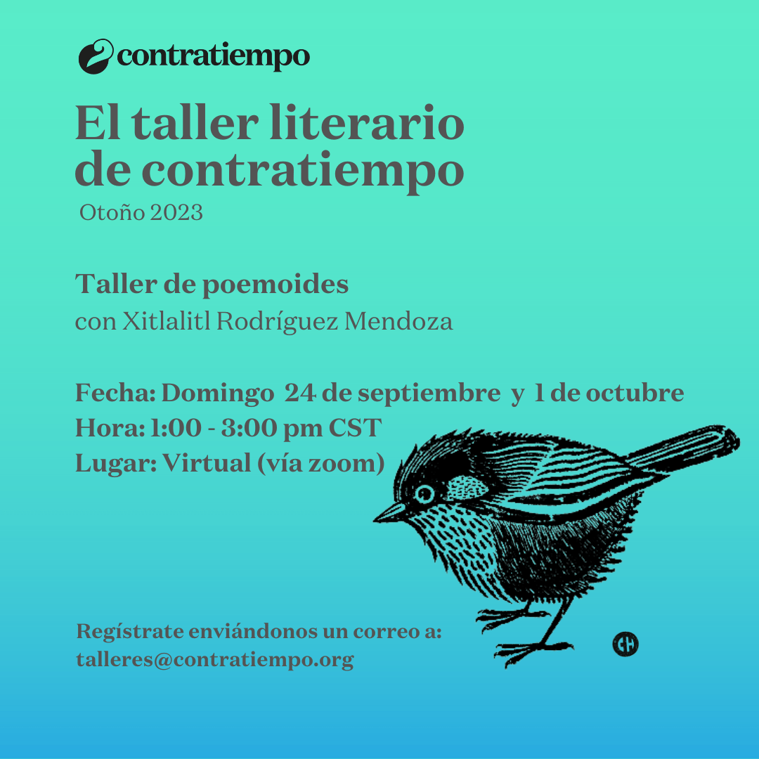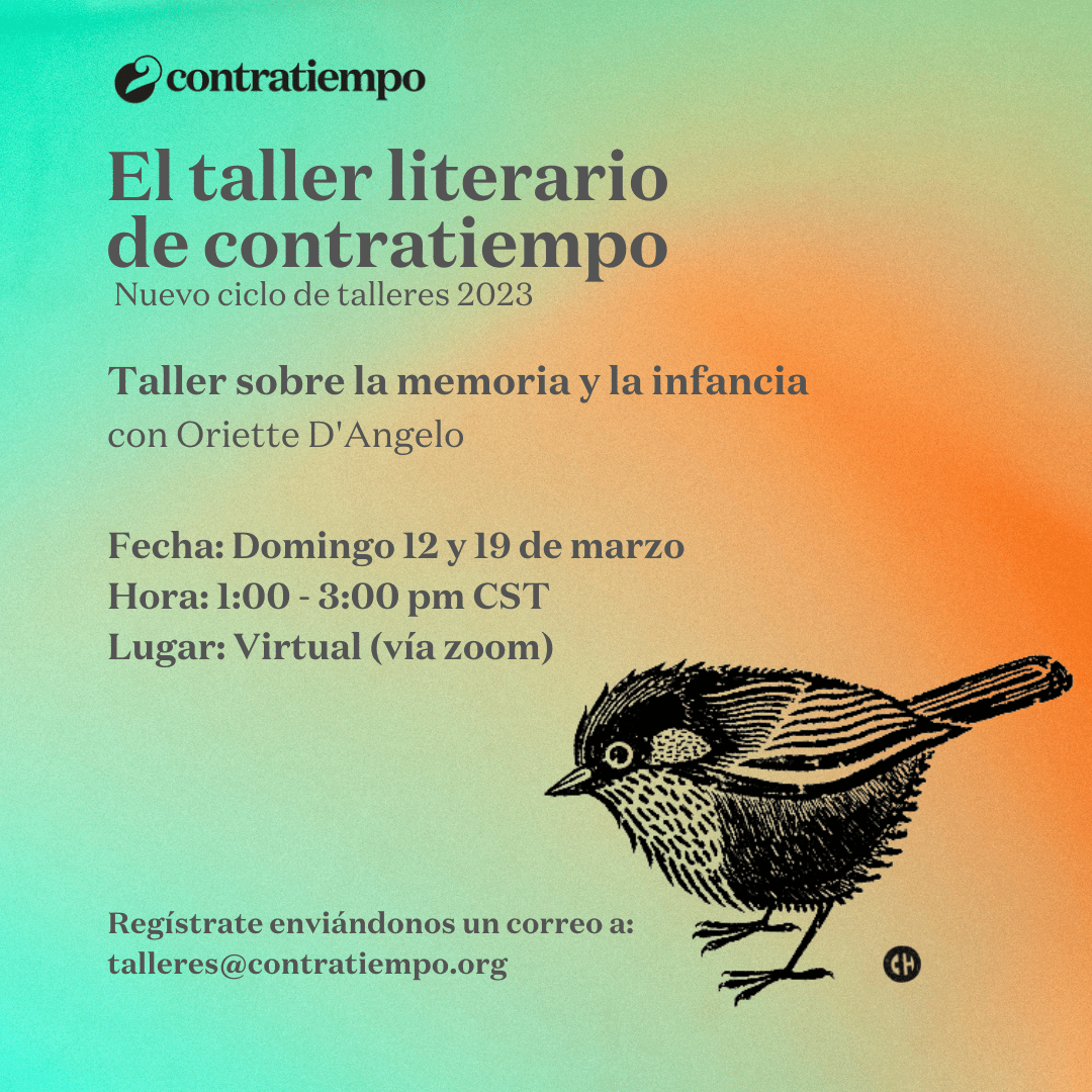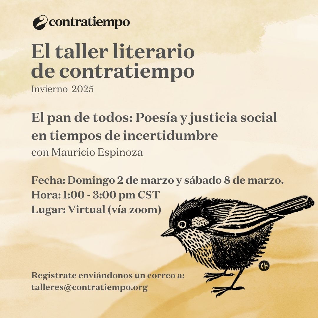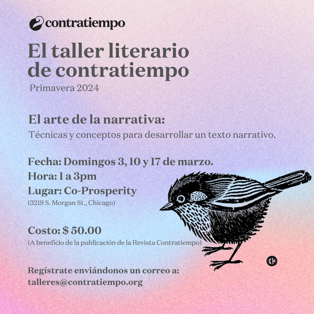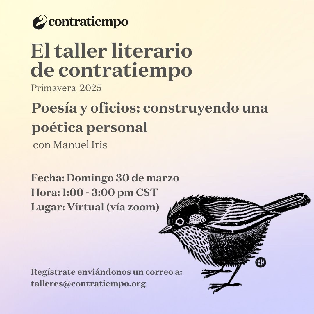 El taller literario de contratiempo no es un discurso, no es un método, no tiene una fórmula para hacerte poeta o escritor. El taller por su connotación artesanal es un lugar donde se trabaja la palabra y se siembra lo que se escribe, se riega con lo que se desaprende y sólo depende de uno que se coseche algo. El taller es un espacio donde se lee, se analiza, se cuestiona, se aprecia y se critica; es un espacio abierto cuyo centro de retroalimentación está en el intercambio y desarrollo de textos, el amor por la literatura, y la necesidad de escribir. ¿Sufre de monólogos?, ¿gerundios, adverbios?, ¿le han diagnosticado mala poesía?, ¿escribe sobre amor?, ¿lee con timidez?. El propósito del taller es subversivo, es un preludio a la voz. Escribimos para acercarnos a nosotros mismos sin solemnidad y para que la palabra y la experiencia de nuestra generación, en este principio de siglo, prevalezca entre las lenguas.